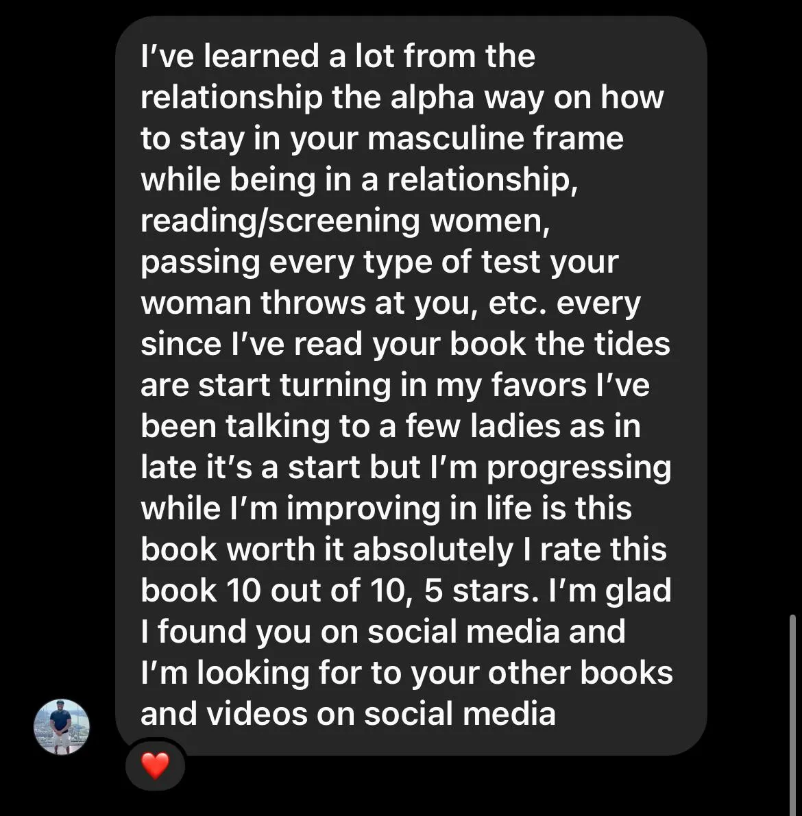"I used to be a complete beta male, taking advice from girls that didn't work and following the red pill movement, which only left me resentful towards women. Then I found you Czar. Now, my girlfriend is chasing me, writing me sexy love notes, bringing me food to school every day, sending good morning and good night texts. I've even had countless guys approach me, asking how I acheived this!. And I just send them straight to your social media or website. Thank you."